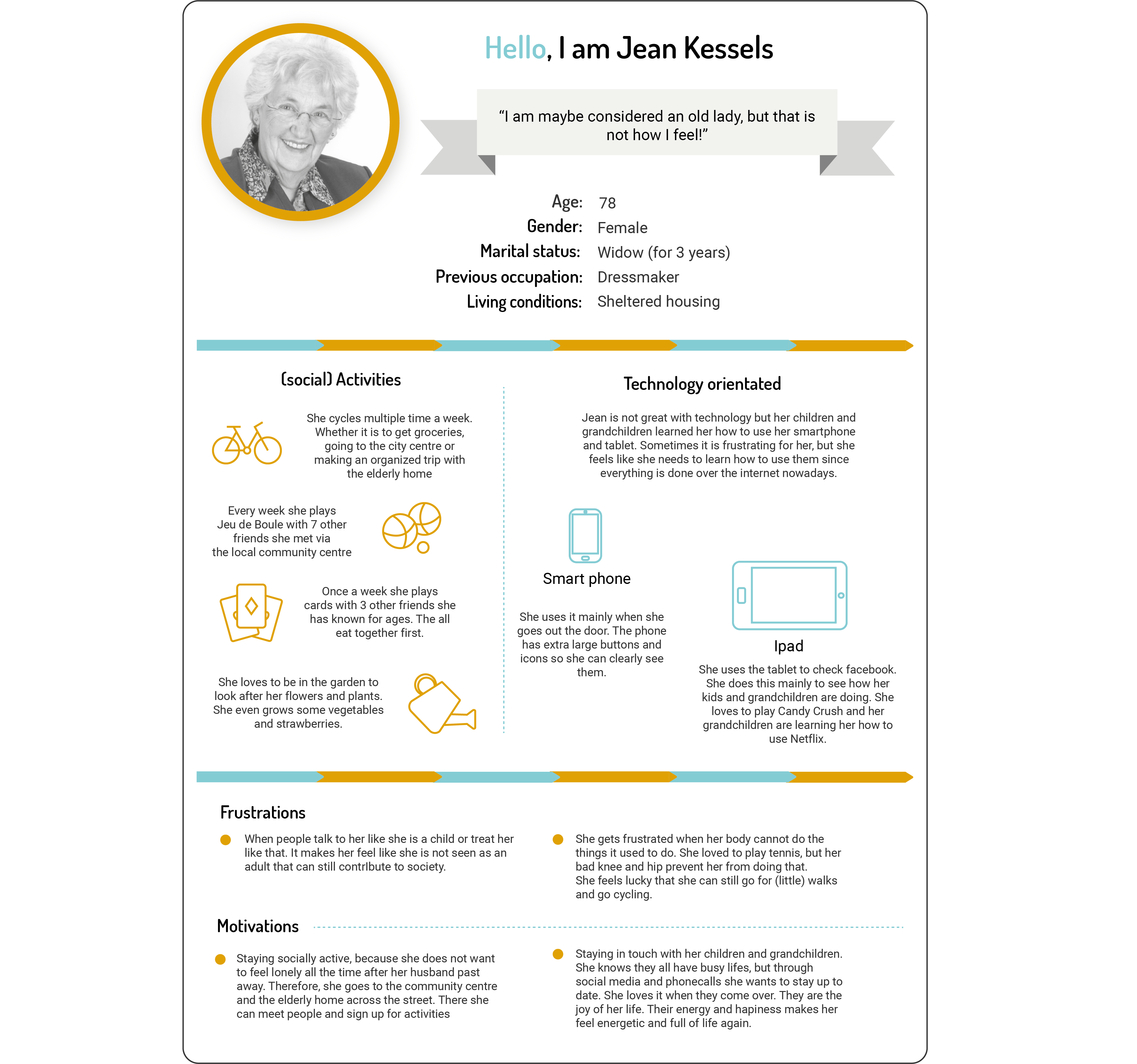 Based on the research and empathising phase, I learned that there are many types of elderly. Therefore, I created a persona to maintain a clear design focus. The persona is based on the workshops and interviews I conducted.