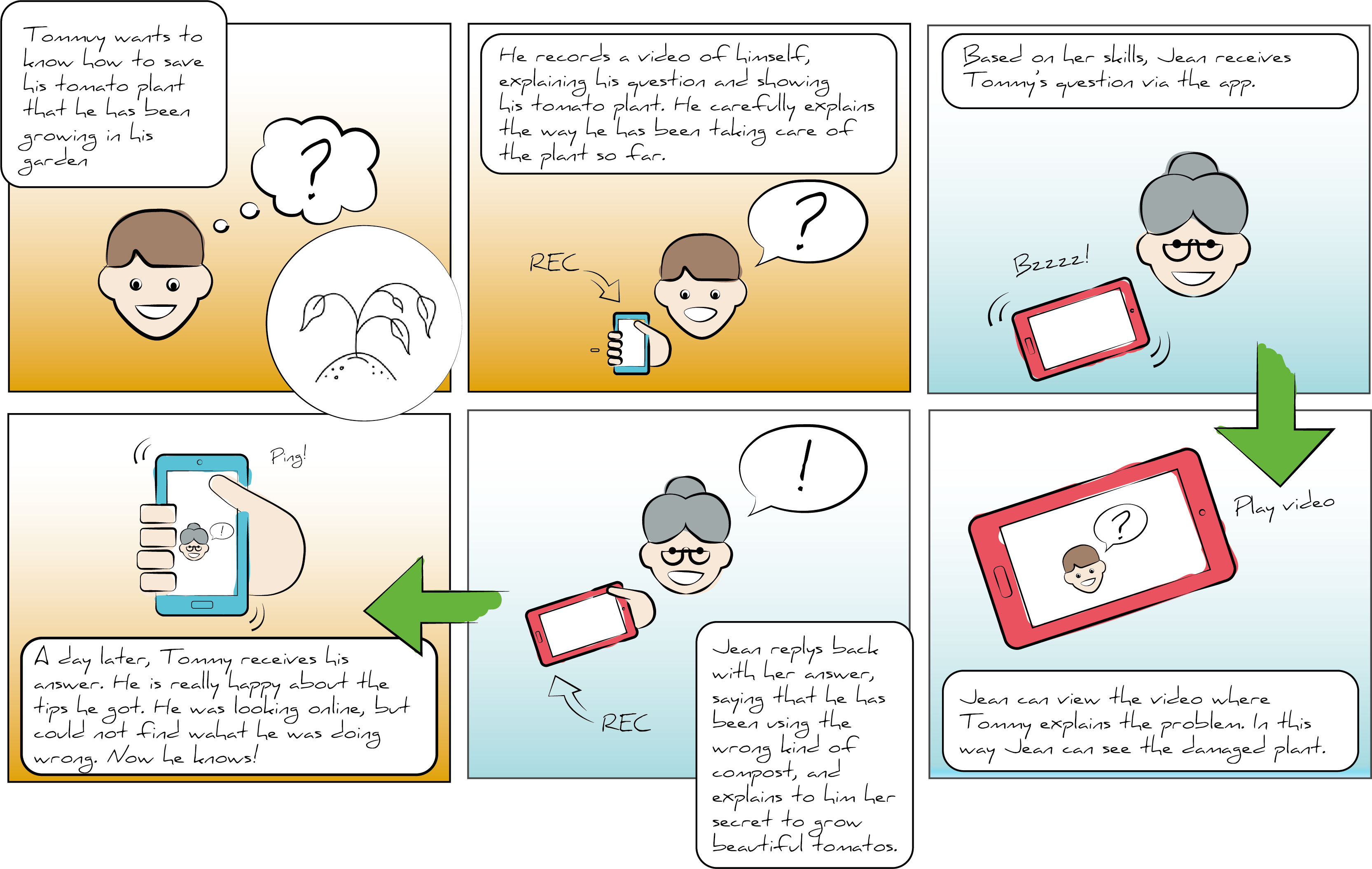 The final concept can be seen as a ‘Marktplaats’ app for knowledge.  The app connects the elderly with younger generations. Elderly have knowledge that younger people nowadays no longer learn in school. From this perspective, the elderly can be seen as professionals and their knowledge can serve as tool to connect with  younger age groups. The design solution entails a mobile application that enables (young) users to record questions. Elderly on their turn receive these questions on their tablet based on their specific skill set. They can reply with an answer by creating a short video. The receiving user can then create a thank you card to send to the elderly person who helped him or her.