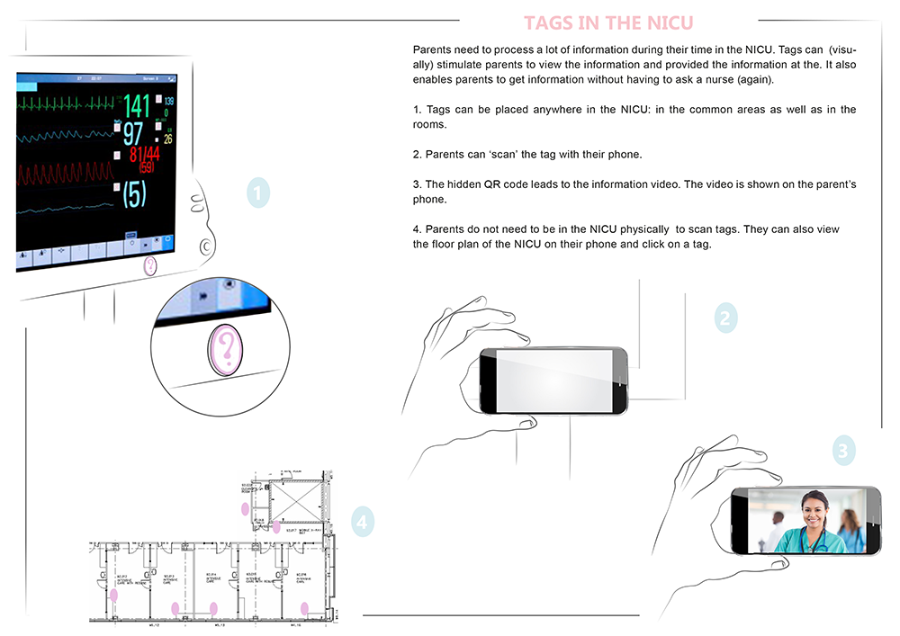 - An app is not directly visible in the space, thus people can opt-out and forget about using the app. Therefore, my aim was to explore design solutions that place (parts of) the mobile application in the space, thus making the app part of the NICU environment. This facilitates parents to make use of mHealth technologies, which might solve the current issue that parents don’t read information flyers or fill in forms consistently.