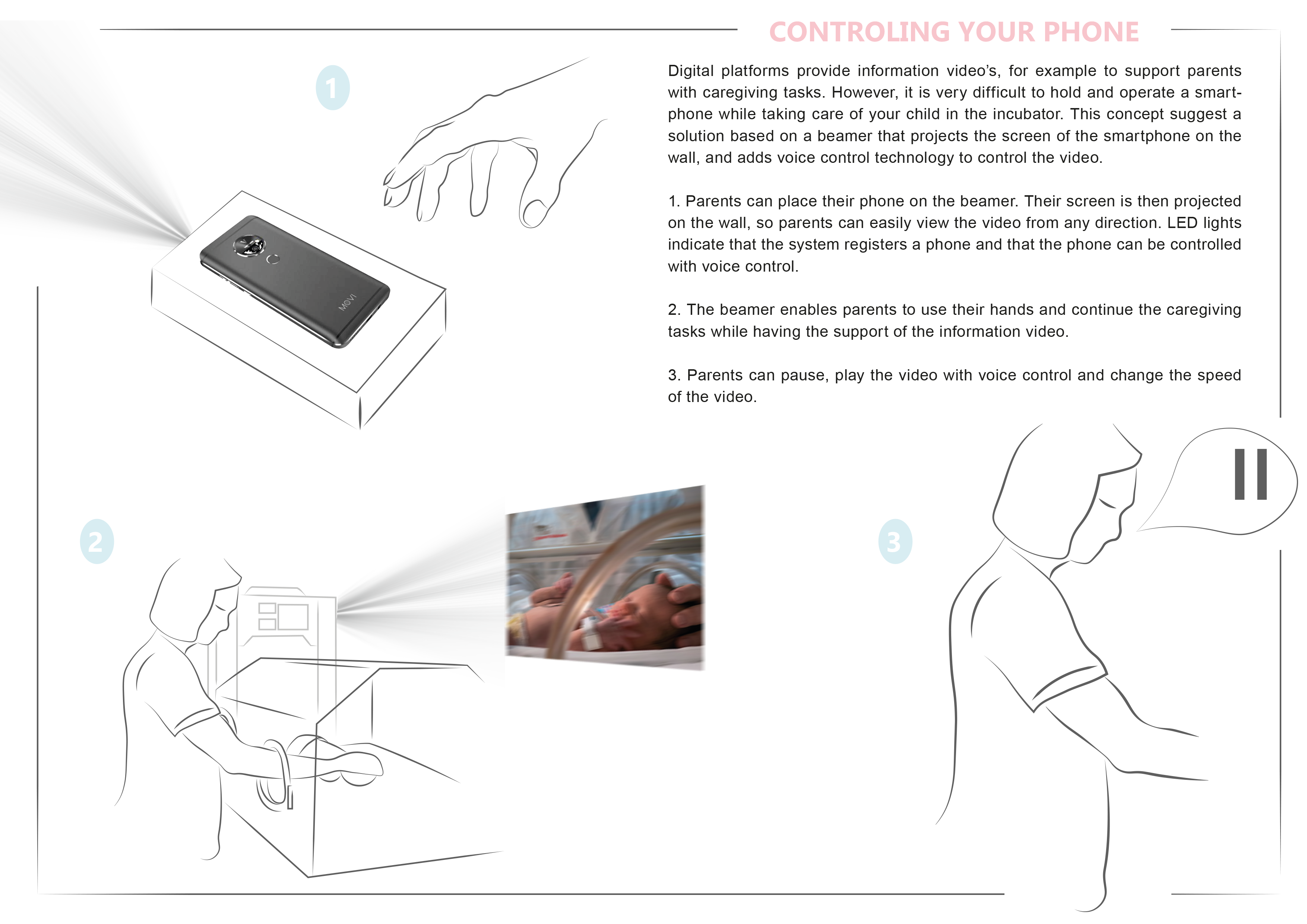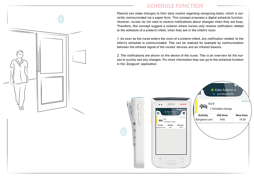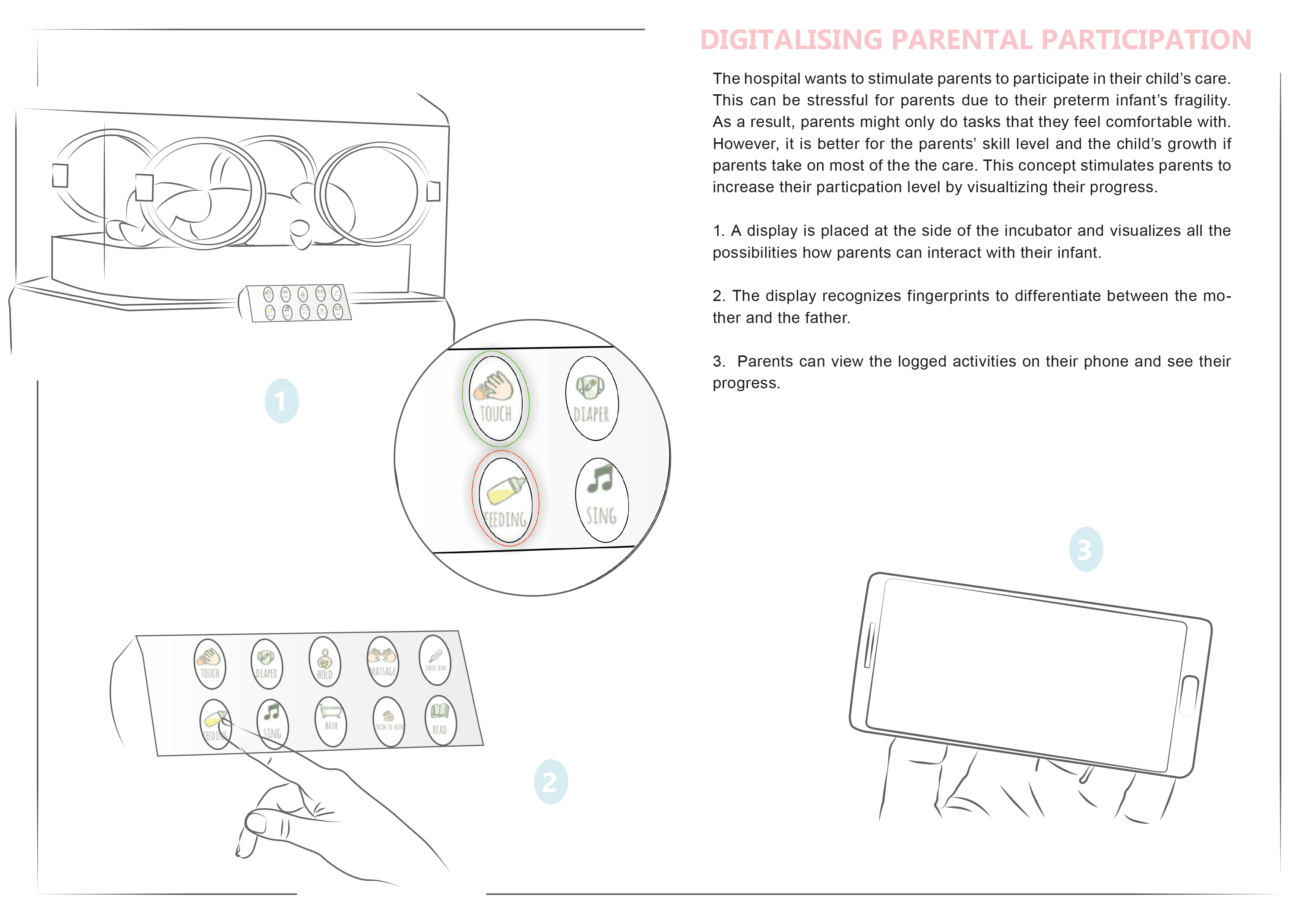 After the feedback of the stakeholders, we ended up with one (revised) concept. The final concept consists of a device that is attached to the side of the incubator, and an app for parents and nurses. The concept aims to (further) improve communication between parents and nurses in the NICU. The app includes a timetable function regarding caregiving activities. The function of the device is to log parental participation in order to generate a caregiving trajectory. In this way, parents can see their development regarding the caregiving of their child, and nurses can identify how to support parents.